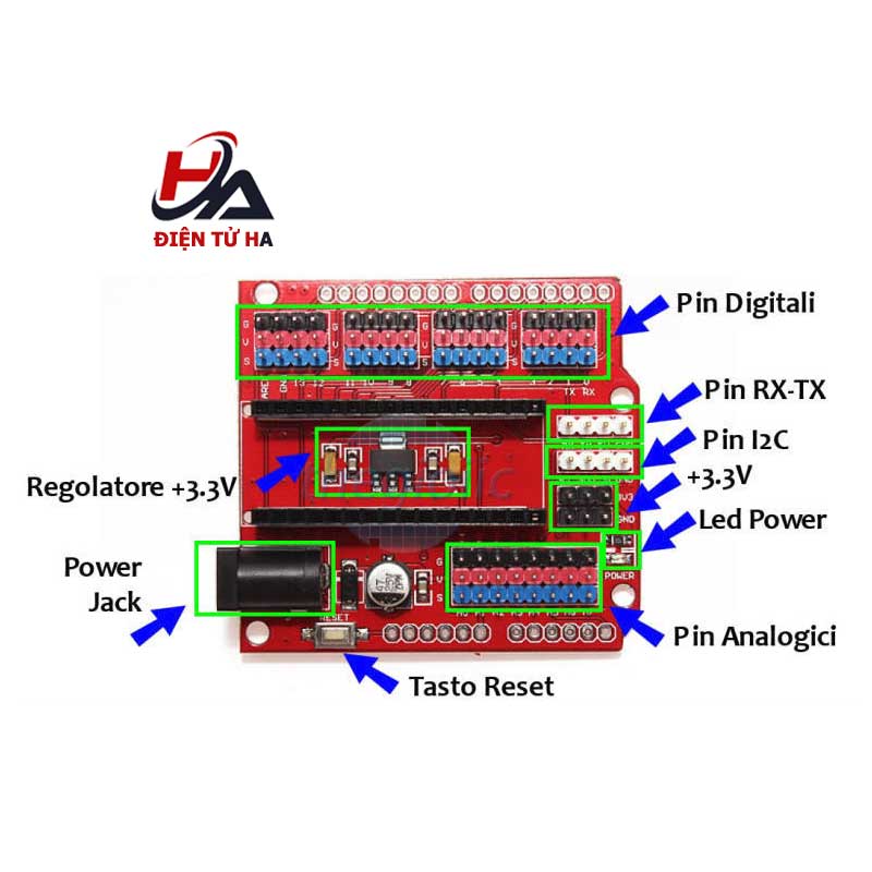 Đế ra chân Arduino Nano I/O Shield V2 được sử dụng với Arduino Nano giúp chuyển từ kiểu chân của Arduino Nano sang kiểu chân và kích thước Arduino Uno, đồng thời mỗi chân của Nano sẽ kèm theo cặp tiếp điểm VCC / GND giúp dễ dàng kết nối với cảm biến, RC Servo, …, ngoài ra đế còn tích hợp thêm cổng đầu ra UART, I2C và IC nguồn tạp áp 3.3VDC bổ sung.